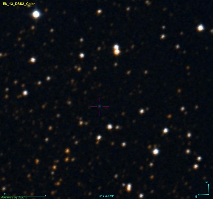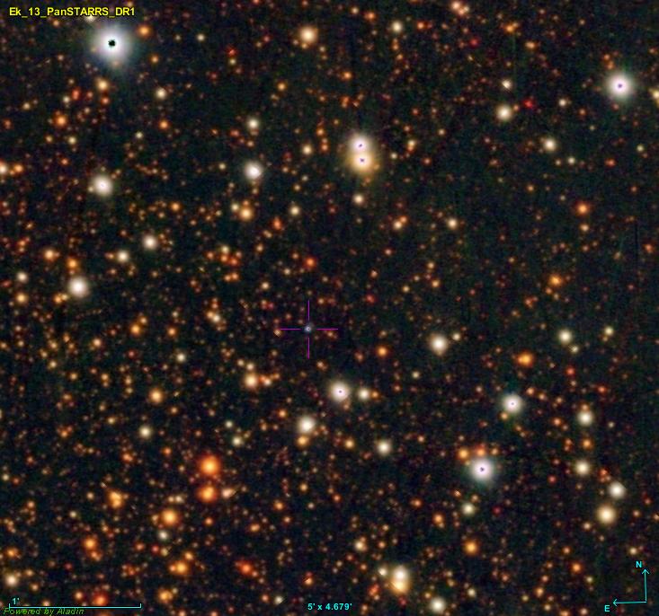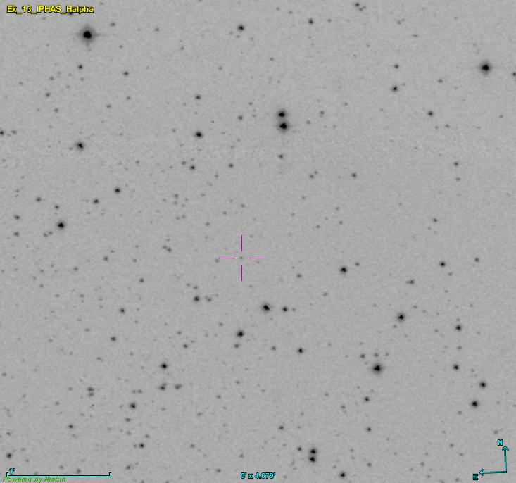 | | Ek 13 | Eklund | | Statut: | | PN-G: 041.1+00.9 | Coordonnées: 19:02:54.34 +07:43:30.79 | | Origine: Sven Eklund, PanSTARRS | Dimensions: 2.6 arc min | | Image(s) réalisée(s): Halpha, [OIII] (S. Eklund) [1] | | Publication: non publiée |