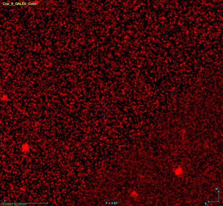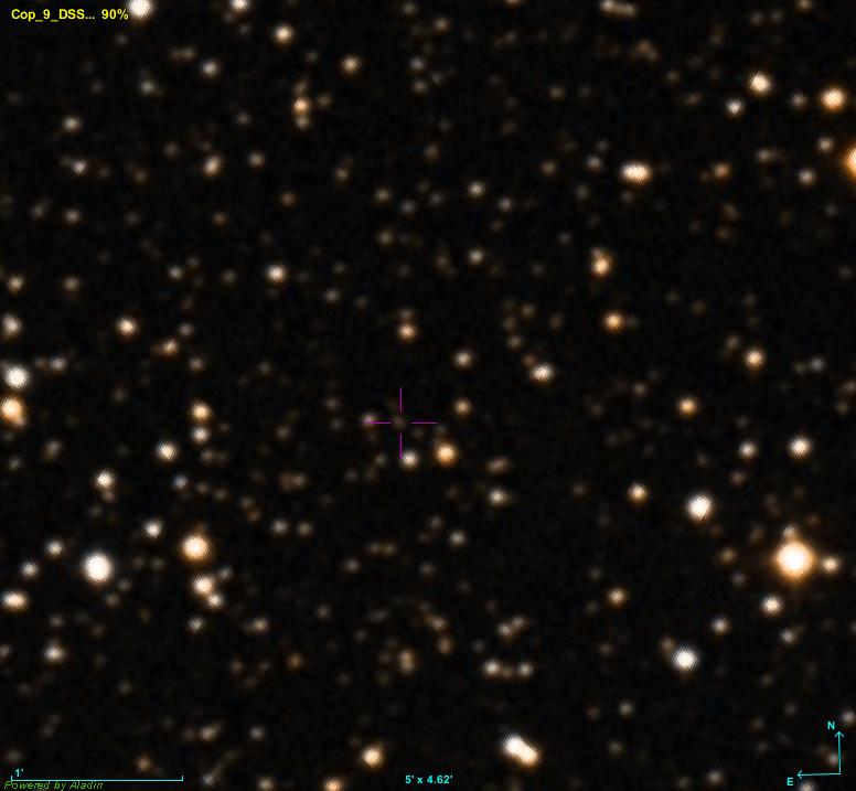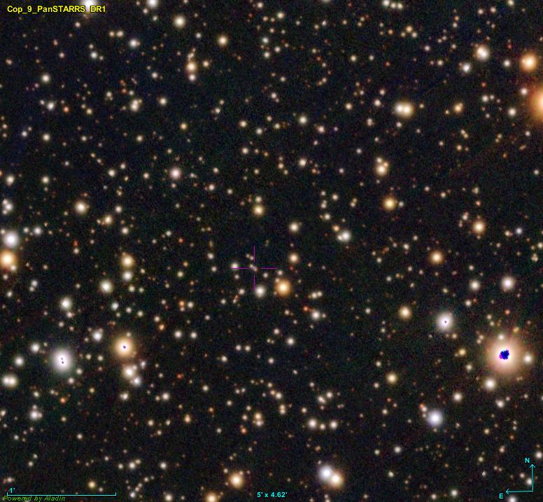 | | Cop 9 | Coppe | | Statut: | | PN-G: 102.6+05.2 | Coordonnées: 21:51:38.37 +60:49:24.57 | | Origine: Timothy Martin, PanSTARRS | Dimensions: 2.4 arc min | | Image(s) réalisée(s): Halpha, [OIII] () [1] | | Publication: non publiée |