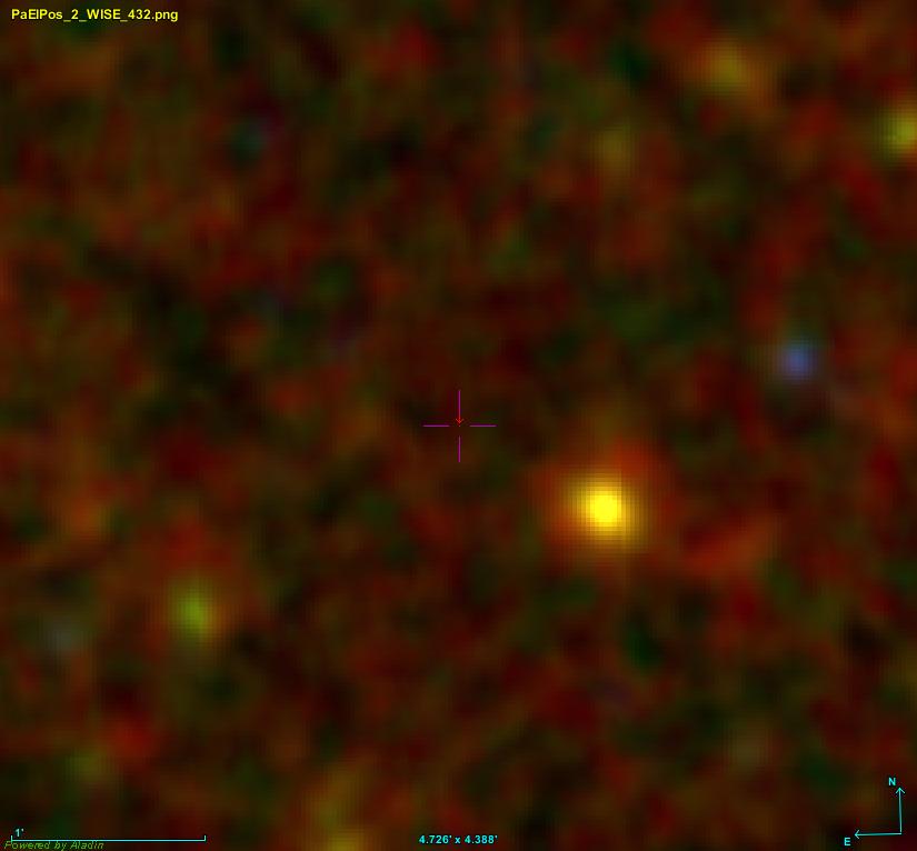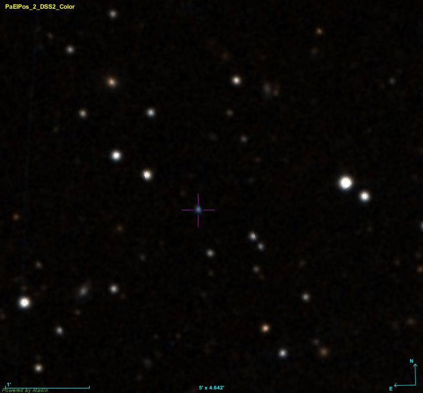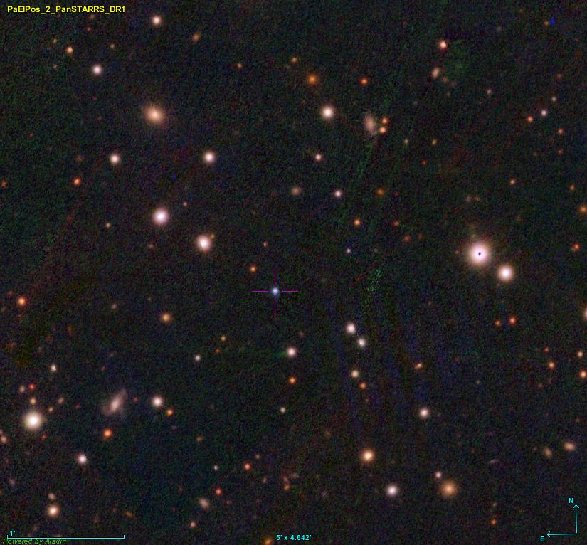 | | PaElPos 2 | Patchick - Elmore - Post | | Statut: Nouvelle candidate | | PN-G: 105.1+24.0 | Coordonnées: 19:19:42.34 +73:40:01.55 | | Origine: David Elmore, Madison (MJ) Post, PanSTARRS | Dimensions: 7 arc min | | Image(s) réalisée(s): Halpha, [OIII] (M. Post) [1] | | Publication: non publiée |