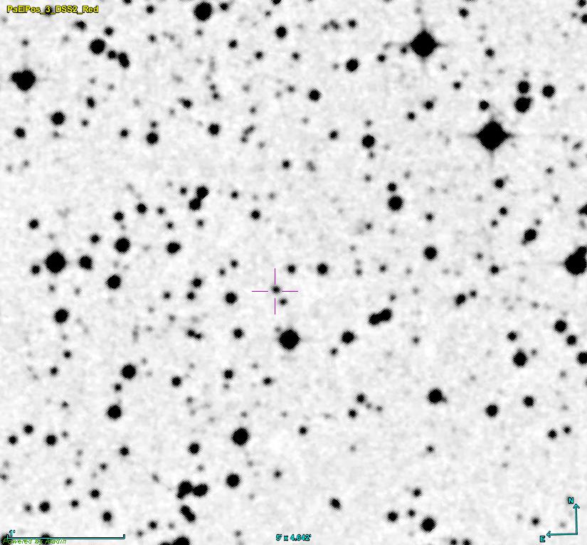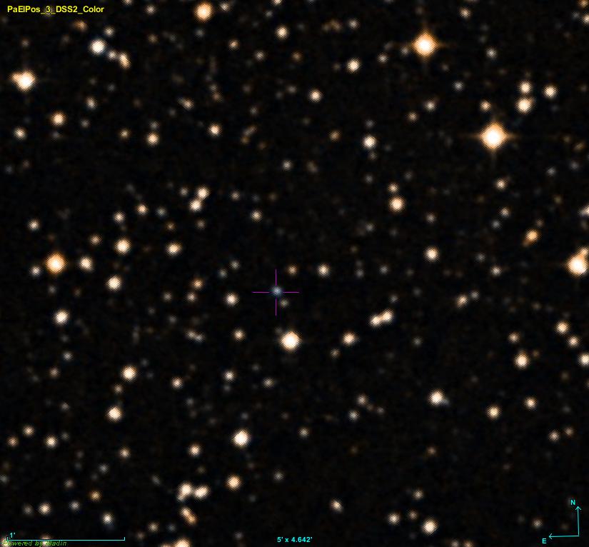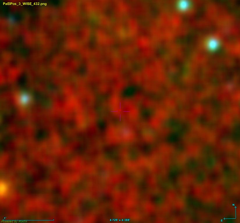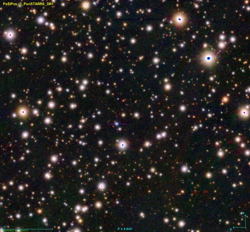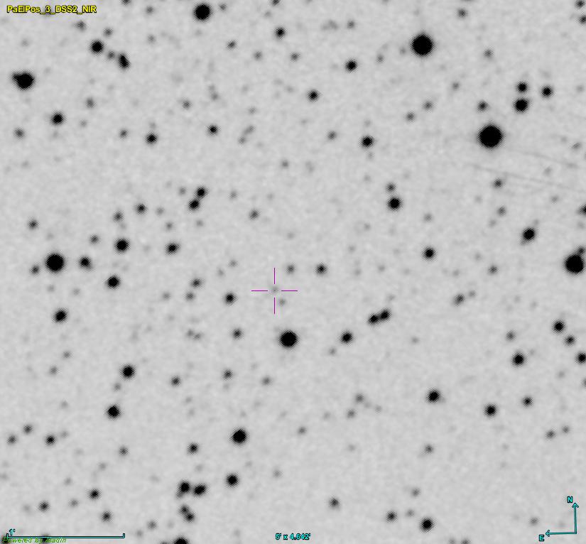 | | PaElPos 3 | Patchick - Elmore - Post | | Statut: Nouvelle candidate | | PN-G: 043.5-13.6 | Coordonnées: 19:59:15.11 +02:56:53.64 | | Origine: David Elmore, Madison (MJ) Post, PanSTARRS | Dimensions: 3.9 arc min | | Image(s) réalisée(s): Halpha, [OIII] (M. Post) [1] | | Publication: non publiée |